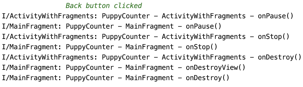 Закрыв приложение, вы запустили процесс уничтожения активити. Как и раньше, события жизненного цикла фрагмента следуют за событиями жизненного цикла активити. И активити, и фрагмент сначала приостанавливаются, затем останавливаются и, наконец, уничтожаются.