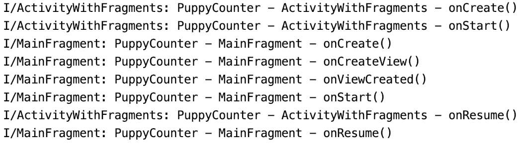 Обратите внимание, как жизненный цикл фрагмента синхронизируется с жизненным циклом активности. Сначала приложение создает и запускает ActivityWithFragments