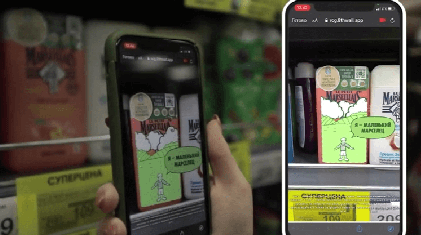 Покупатель наводит камеру смартфона на этикетку Le Petit Marseillais и видит анимированный контент о ценностях бренда.