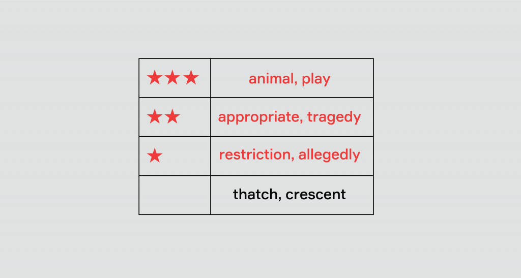 Красные слова с тремя звездочками занимают в частотном словаре места с 1-го по 2500-е, слова с двумя звездочками — с 2501-го по 5000-е, а слова с одной звездочкой — с 5001-го по 7500-е. Черные слова располагаются ниже 7500-го места. Для пользователя это имеет очень простые следствия. Если ты ищешь в словаре слово и видишь при нем три звездочки, выучи его обязательно: оно наверняка попадется еще много раз. Если при слове только одна звездочка, это достаточно полезное слово, но часто не пригодится. И, наконец, черные слова — совсем редкие; их стоит заучивать, только если стремишься выучить язык на продвинутом уровне, но если не получится, то ничего страшного. Можно прекрасно говорить по-английски, не зная, что thatch значит «соломенная крыша», а crescent — «полумесяц»; без слов restriction «ограничение» и allegedly «якобы» тоже можно прожить, а вот слова animal «животное» и play «играть» точно надо знать.