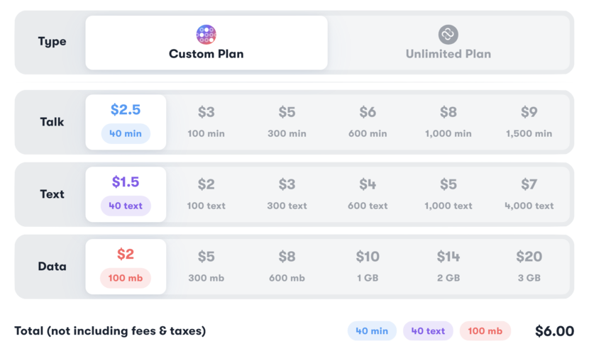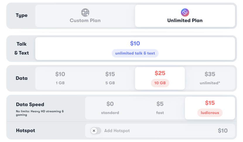 С US Mobile, есть два основных предложения плана — Индивидуальный план и Безлимитный план. Пользовательский план позволяет вам точно указать, сколько разговорных минут, текстов и данных вы планируете использовать каждый месяц. Безлимитный план включает в себя неограниченное количество разговоров и текста по умолчанию, но вы можете выбрать, хотите ли вы 1 ГБ, 5 ГБ, 10 ГБ или неограниченное количество данных. Кроме того, вы также можете выбрать предпочитаемую скорость передачи данных.