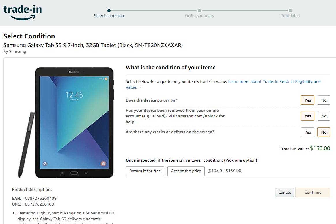 Как и на некоторых других сайтах, посвященных обмену электроникой, следуйте инструкциям на экране, чтобы ответить на вопросы об изделии, а затем распечатайте этикетку для отправки. Вам не нужно предоставлять много информации о каждом продукте, кроме состояния: плохое / сломанное , среднее , отличное или новое .