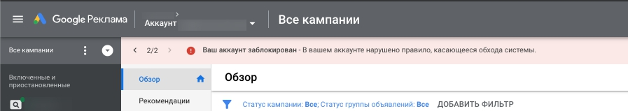 Если ваш аккаунт Google Ads заблокировали, вы получите оповещение об этом на почту, а также увидите красную плашку с краткой причиной блокировки при входе в аккаунт.