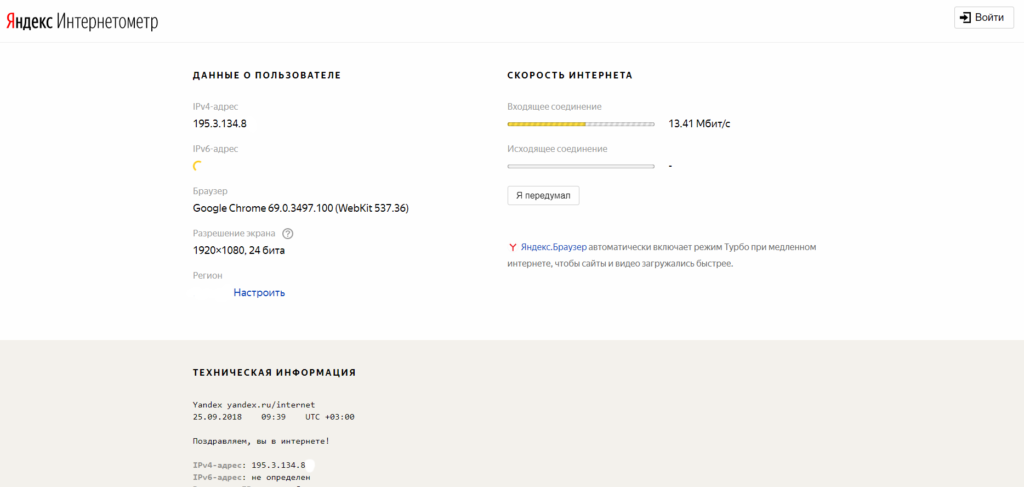 Сервис Яндекс.Интернетометр определяет скорость входящих и исходящих соединений без пинга. Однако в дополнение к этому он показывает подробную информацию о вашем интернет-соединении, операционной системе и браузере, в котором вы отметились. Обидно, что здесь не представлены бенчмарки и возможность сохранять результаты тестов.