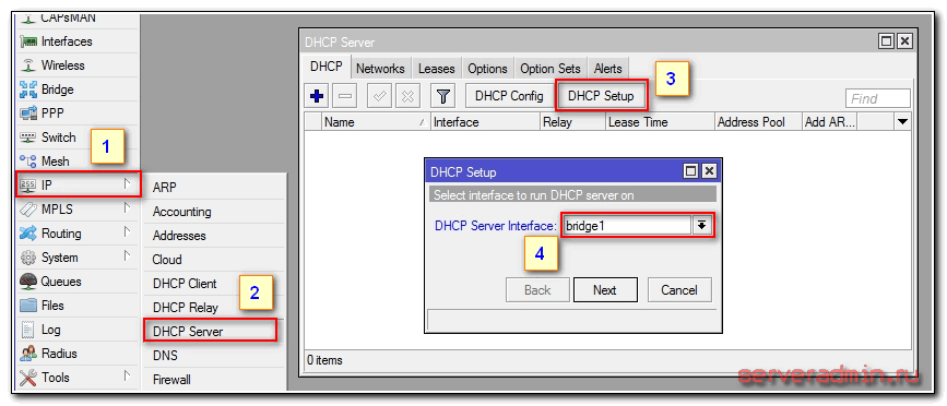 Для того, чтобы подключенные устройства могли получать сетевые настройки автоматически с роутера, на нем необходимо настроить DHCP сервер. Делается это не сложно, я сейчас по шагам все распишу. Идем в IP -> DHCP, переходим на вкладку DHCP и нажимаем DHCP Setup. Нам предлагают выбрать интерфейс, на котором будет работать сервер. Выбираем bridge1.
