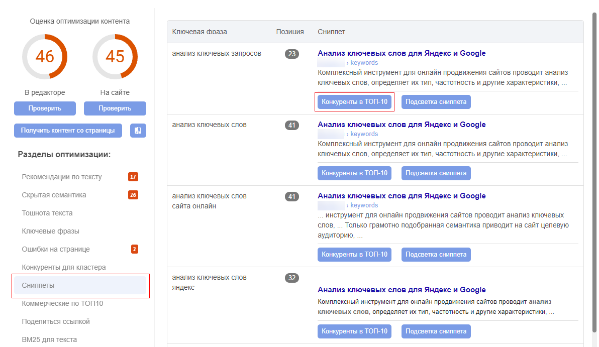 Чтобы ваш сниппет стал более привлекательным для пользователей и занял лучшие позиции, используйте отчет Labrika «Сниппеты свои и по ТОП10» или раздел «Сниппеты» в визуальном редакторе — в нём показаны описания для ключевых фраз, по которым продвигается ваша страница, а также сниппеты конкурентов из ТОП-10. Выберите фразы с низкими позициями и сравните свои описания со сниппетами конкурентов. Так вы узнаете, чего не хватает вашим описаниям, и сможете их улучшить.