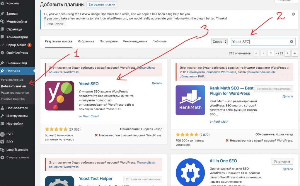 Устанавливается Yoast SEO точно так же, как и все остальные плагины, через пункт меню «Плагины» – «Добавить новый».