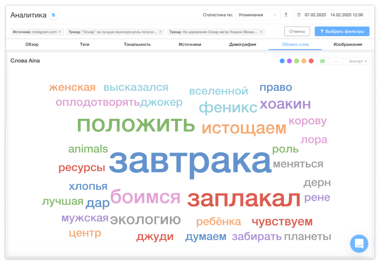 Для этого в фильтрах выбираем тренд «победа за лучшую мужскую роль». YouScan самостоятельно отбирает тематические посты. Далее — смотрим «облако слов».