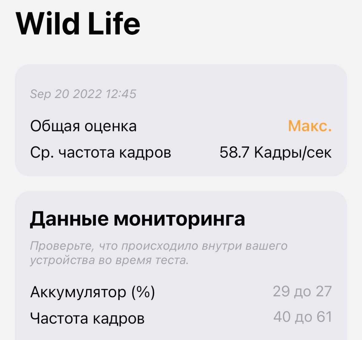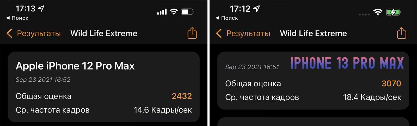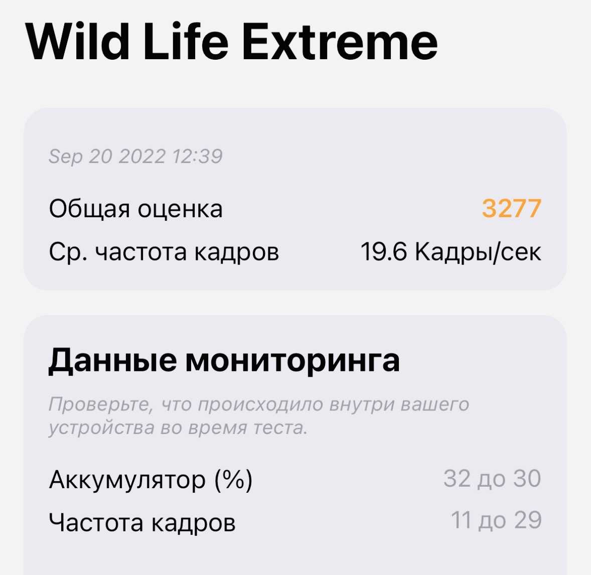 По части трехмерной графики тоже наблюдаем прирост в производительности. В тесте 3D Mark в режиме Wild Life он выдает на 10 FPS больше, чем iPhone 13 Pro и на 1,5 FPS больше в режиме Wild Life Extreme: