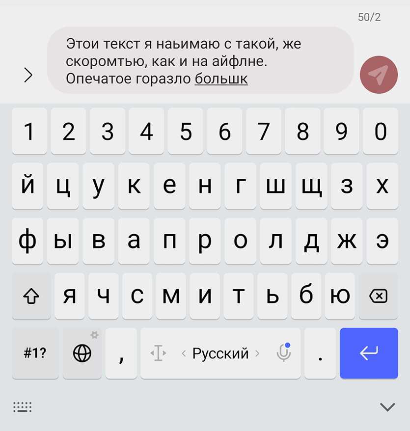 Набор на виртуальной клавиатуре Андроид-смартфона настоящее испытание после iPhone. Вроде бы и размер кнопок тот же, и попадаешь пальцем куда надо, а на экране появляется абракадабра, потому что система распознаёт мои нажатия совершенно неправильно и печатает не нужную мне букву, а соседнюю.