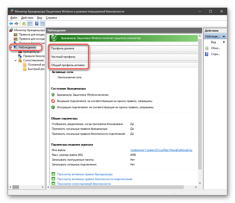 Профили представляют собой набор параметров для разных типов подключений. Существуют три их типа: «Общий», «Частный» и «Профиль домена». Мы их расположили в порядке убывания «строгости», то есть уровня защиты.