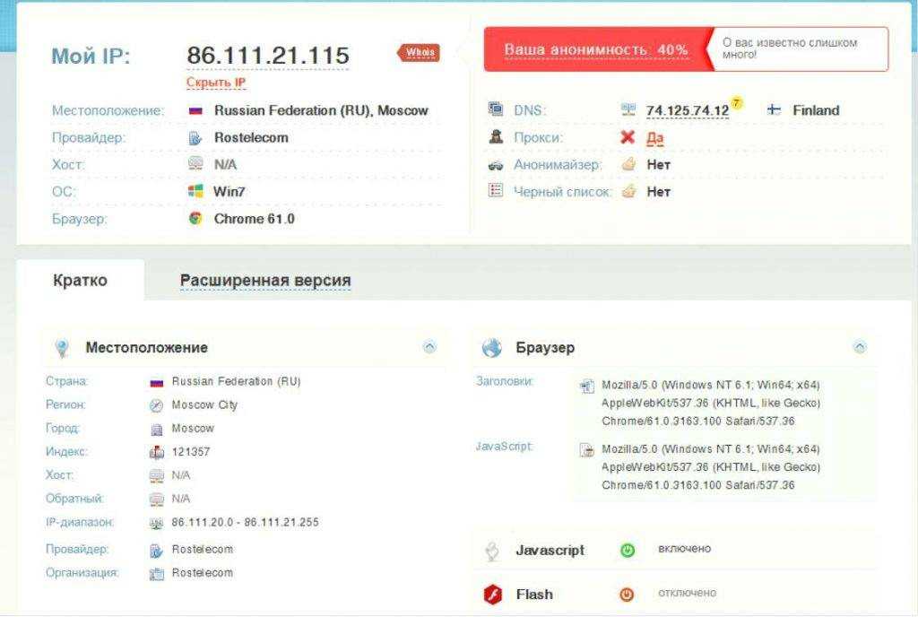 Местоположение устройства, с которого человек зашёл в Интернет, показывается под IP. В приведенном случае Whoer.net распознал реальное расположение в городе Москва.