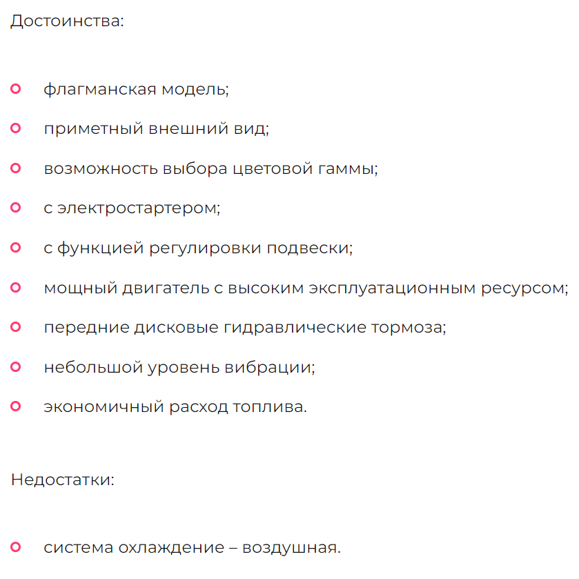 Как и у любого другого вида мотоциклов, у этого тоже есть свои плюсы и минусы.