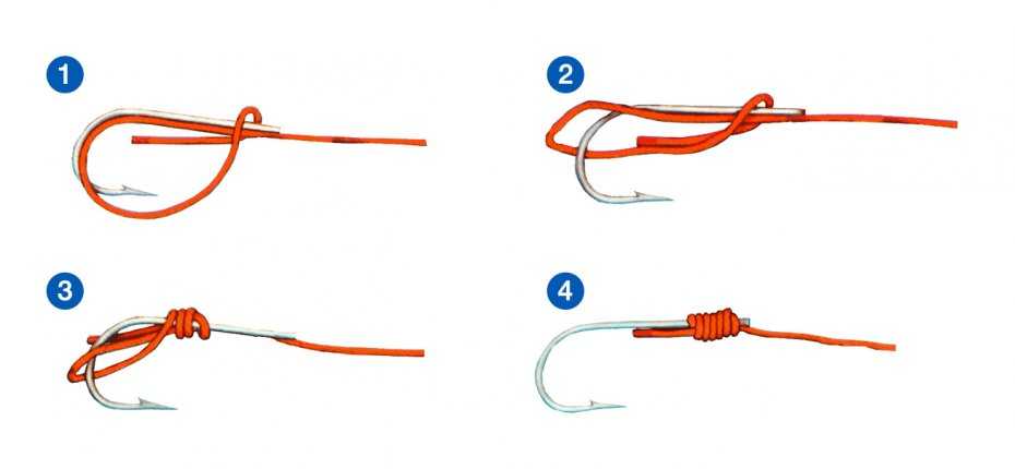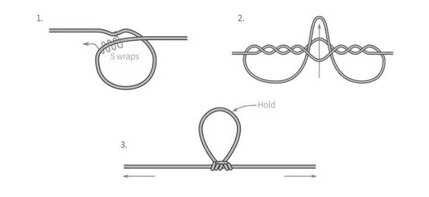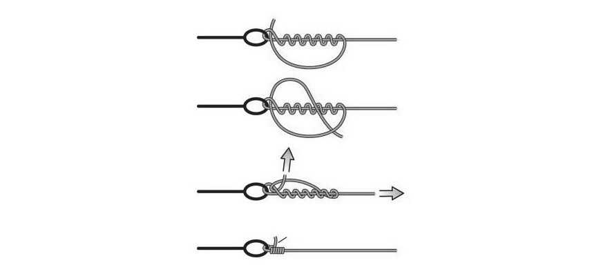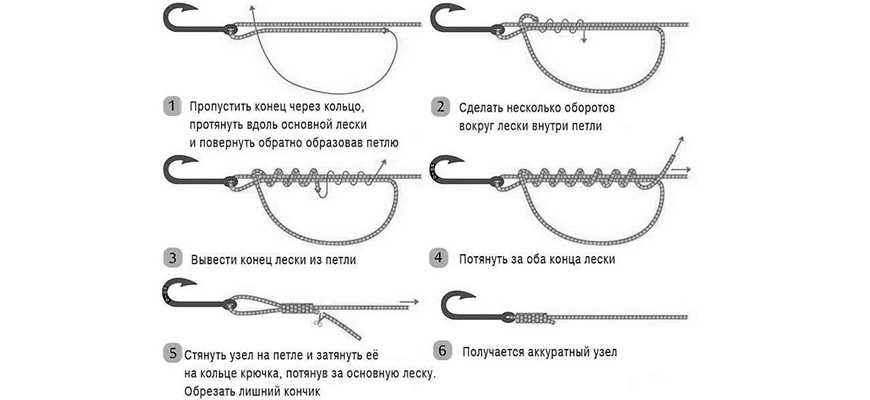 - Петля удерживается пальцами обеих рук, при этом крючок 6–8 раз оборачивается, продеваясь через петлю, скручивая леску у краёв петли.