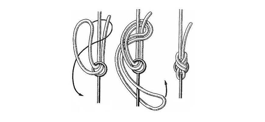 - ходовой конец протянуть сначала в верхнюю петлю, а затем в нижнюю;