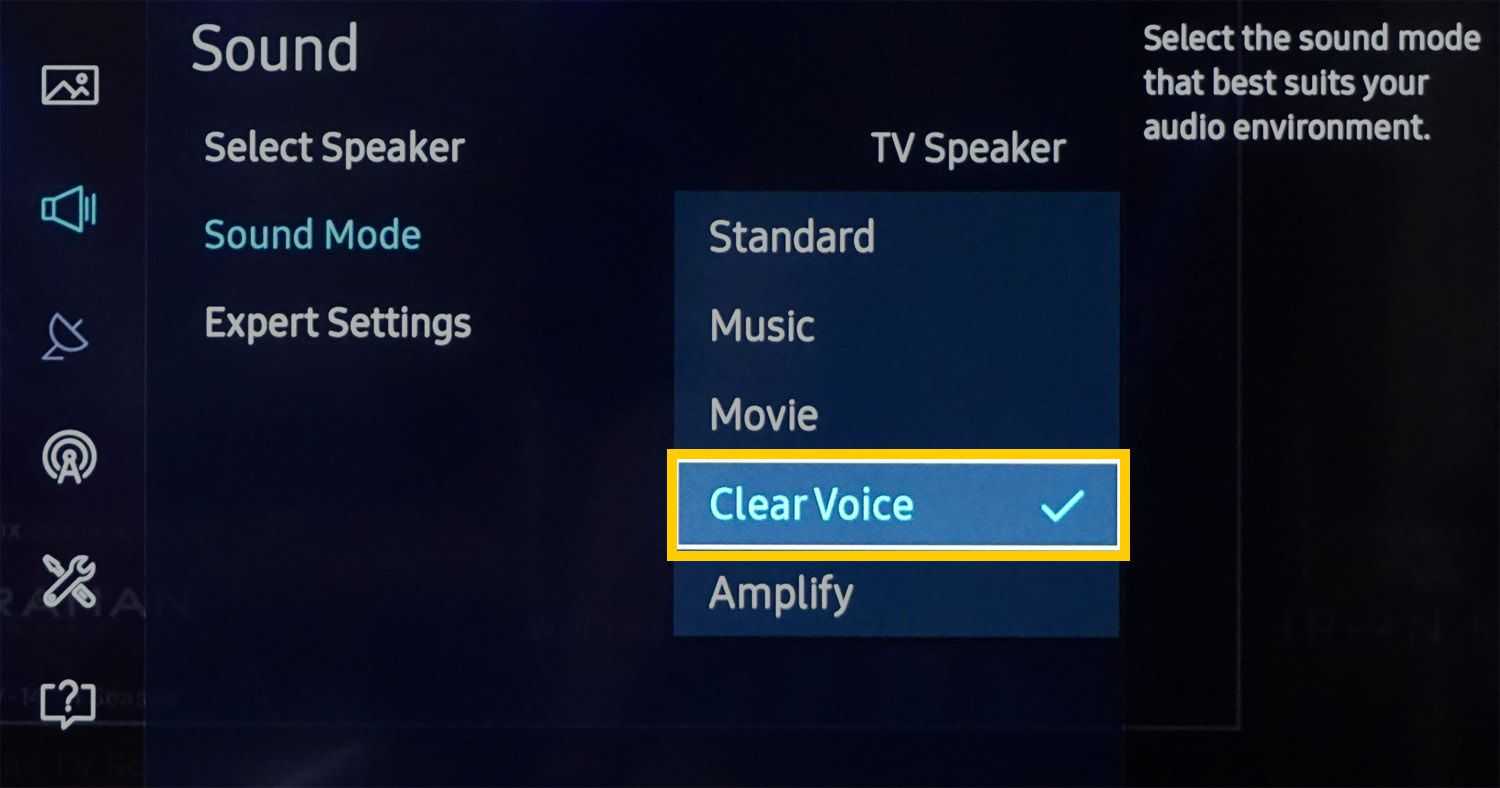 Одна из опций, которую может предложить телевизор Samsung, — это Clear Voice (не то же самое, что версия LG), которая повышает уровень голоса и снижает уровень фонового звука.