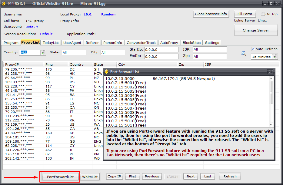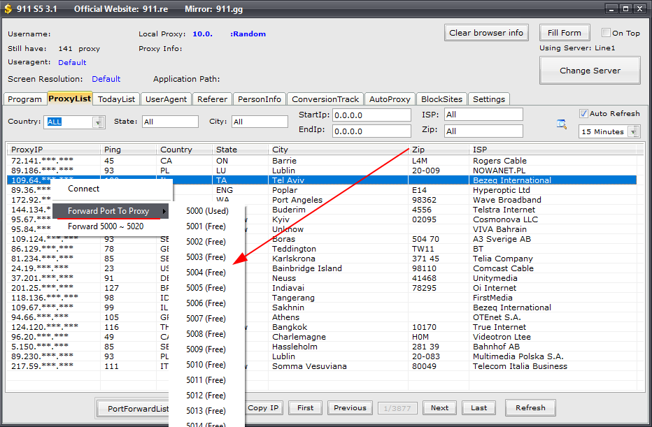 Перейдите во вкладку ProxyList, подберите прокси под ваши параметры, нужную страну, город, штат и дважды нажмите на прокси, который вы бы хотели использовать, после нажимаем на Forward Port To Proxy и тут выбираете свободный порт.