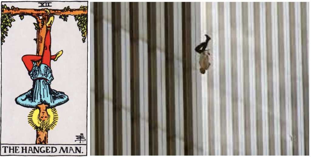 Почти во всех известных событиях есть что-то, что мы запоминаем больше, чем все остальное. Возможно, потому что это выглядело странно, возможно, потому что нам это чаще всего транслировали в СМИ. Когда такое происходит, нужно подумать, а почему нам показывают именно это. К примеру, сотни людей от безысходности срывались вниз, но только одной фотографии удостоили записи в Википедии, длинному репортажу на BBC (даже целому фильму), про этот кадр написал Esquire, Time и т.д. Даже название дали этой ужасающей фотографии – «The Falling Man». И здесь мы видим синхронизацию с очередной картой Таро, которая называется «The Hanged Man».