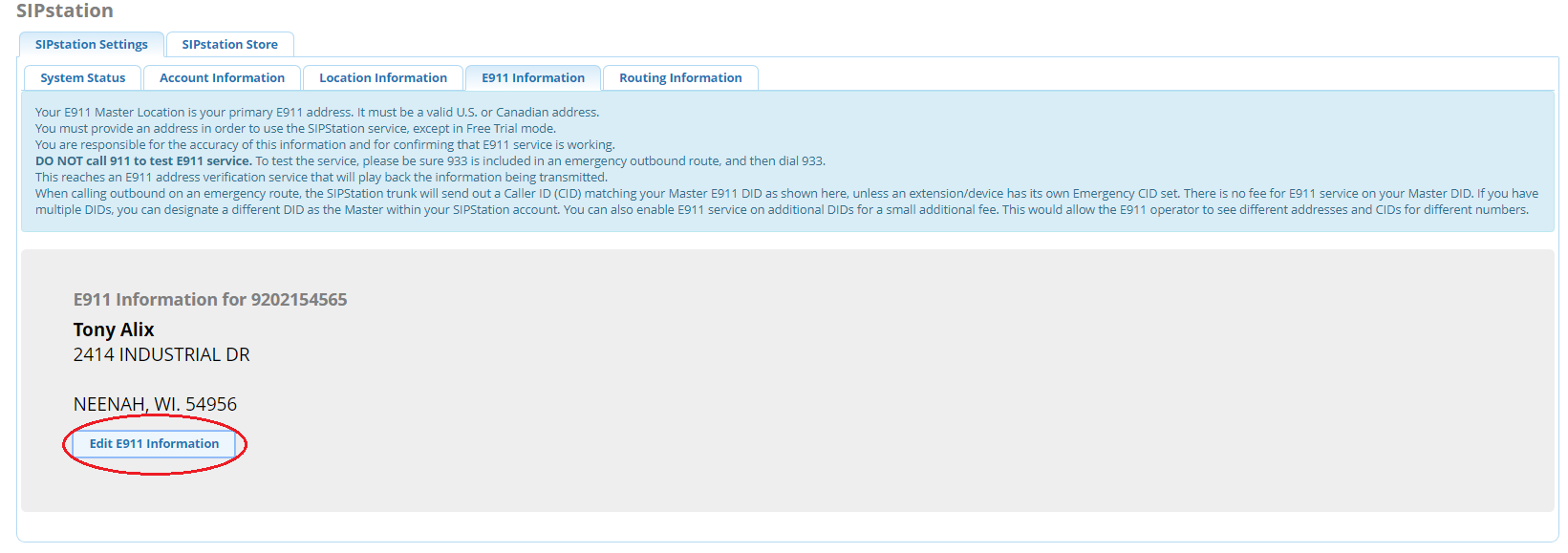 Updating Info for the Master E911 DID: Under SIPStation Settings / E911 Information you’ll see the option to Edit E911 Information. Selecting this option will open a window to update you existing E911 address, see below. To update the address, enter new information (including floor, suite and room number, as applicable) and click the Save Changes button.