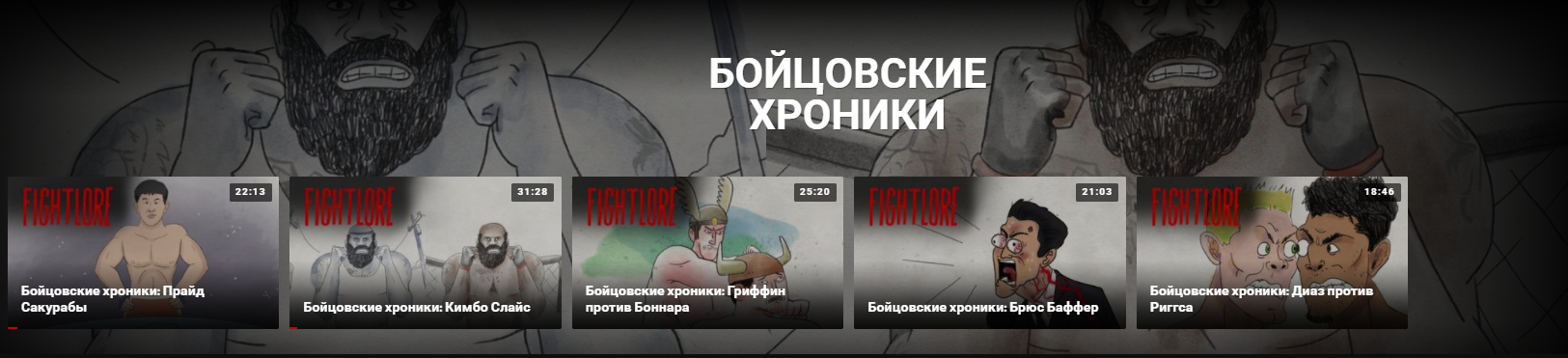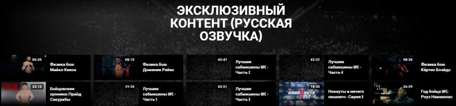 «Архив боев» — в нем собраны записи всех поединков под эгидой UFC, а также видеоархивы более 30 федераций: MMA, бокса, кикбоксинга, муай-тай, джиу-джитсу, включая PRIDE FC, WEC, Strikeforce и Invicta FC. Есть фильтры по годам, дисциплинам и турнирам.