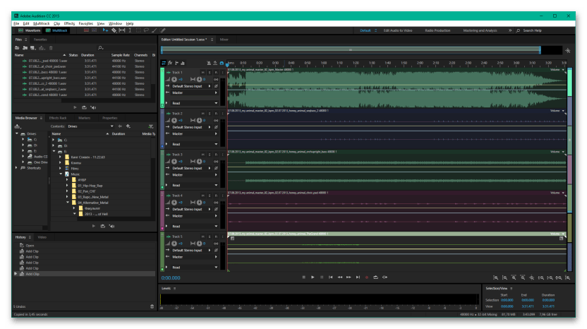 Мощный аудиоредактор Adobe Audition CC поддерживает практически все известные форматы. Он разработан для профессиональных музыкантов, записывающих и сводящих композиции, а также специалистов, занимающихся радиовещанием и созданием подкастов. При помощи него можно записывать треки в мультиканальном режиме, а большой набор инструментов обеспечивает удобный процесс обработки или создания дорожки. Пользователь прямо через интерфейс может копировать компакт-диски и тонко отредактировать частотный диапазон.