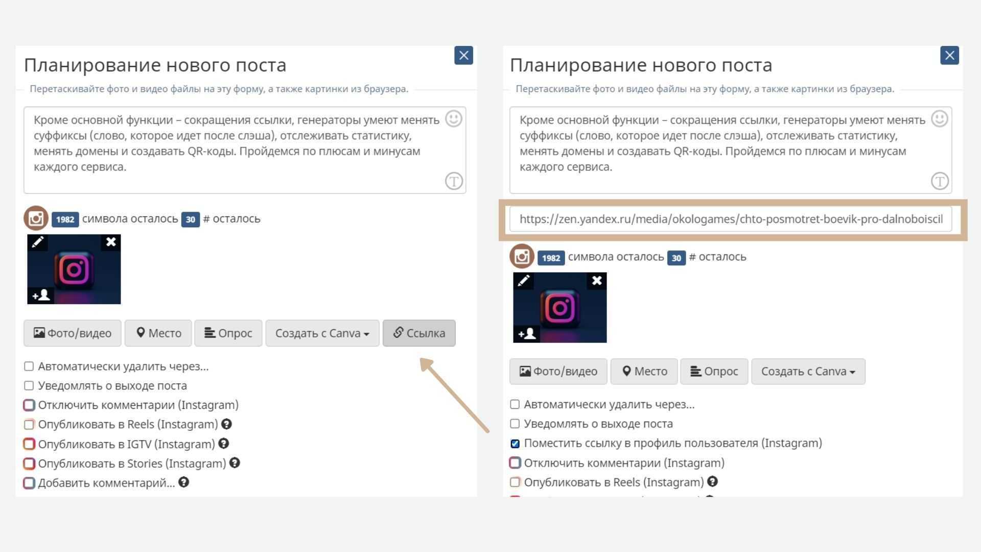 Как вставить ссылку в пост в SMMplanner