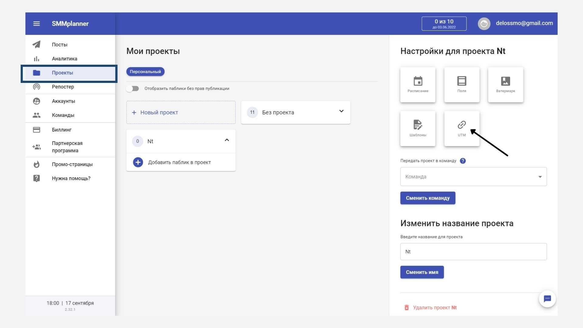 - В «Настройках проекта» выберите пункт «UTM».