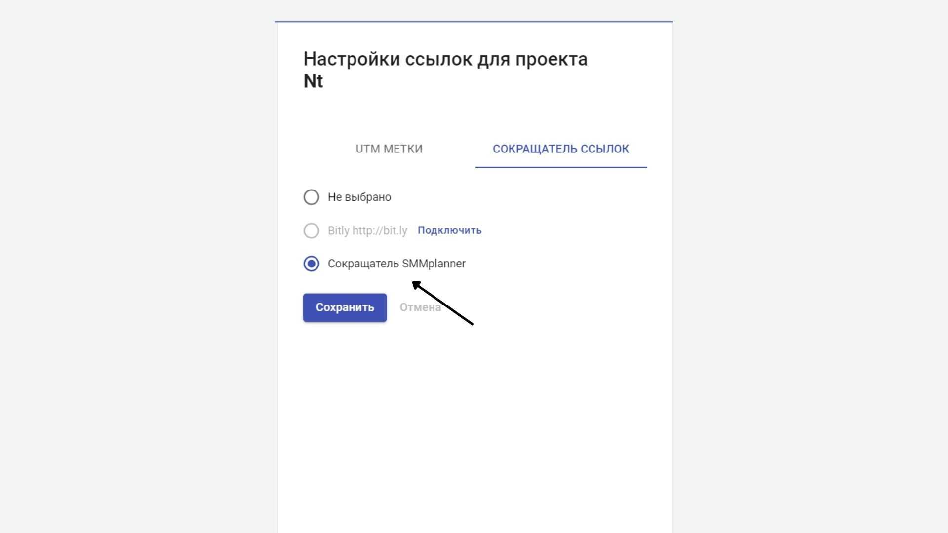 Теперь выберите пункт «Сокращение SMMplanner» или подключите аккаунт стороннего сервиса – Bitly. Сохраните.