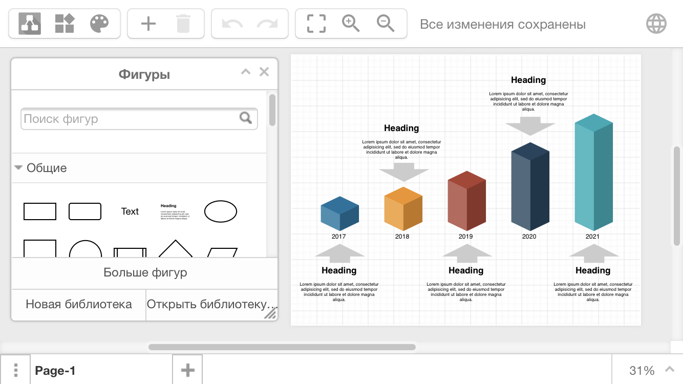 Если вы предпочитаете (или вынуждены) не использовать заготовки, то в draw.io имеется широкий набор инструментов для быстрого и удобного создания бизнес-моделей, схем, алгоритмов и даже инфографики.
