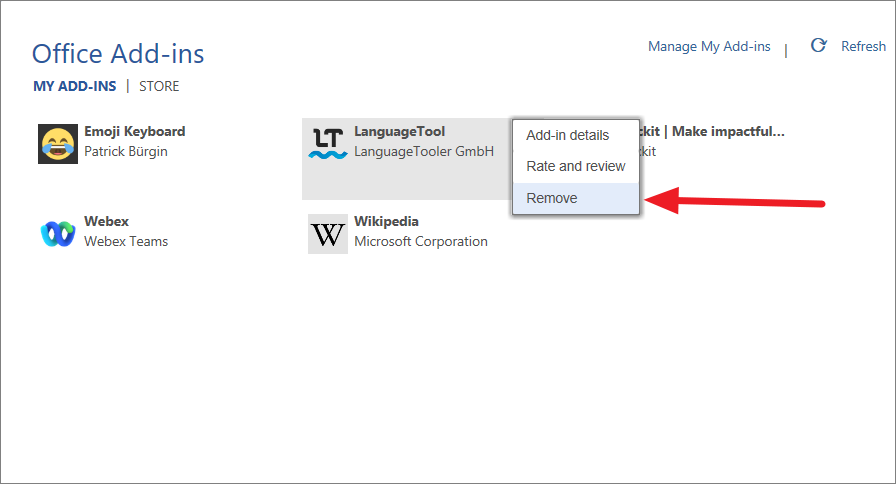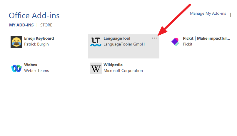 В разделе «Надстройки Office» нажмите кнопку с тремя точками («Параметры») рядом с надстройкой, которую вы хотите удалить.