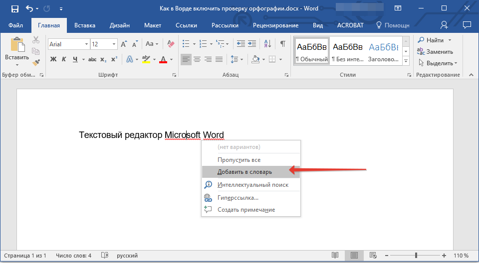 Также с помощью кнопки «Добавить » вы можете добавить правильно написанное слово в словарь.
