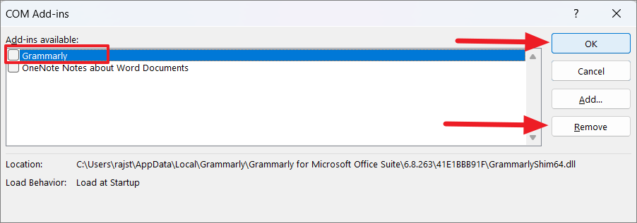 Во всплывающем окне «Надстройки COM» просто снимите флажок с надстройки, которая, по вашему мнению, вызывает проблему, чтобы отключить ее. Если вы хотите удалить надстройку, выберите надстройку и нажмите «Удалить». Затем нажмите «ОК», чтобы закрыть диалоговое окно.