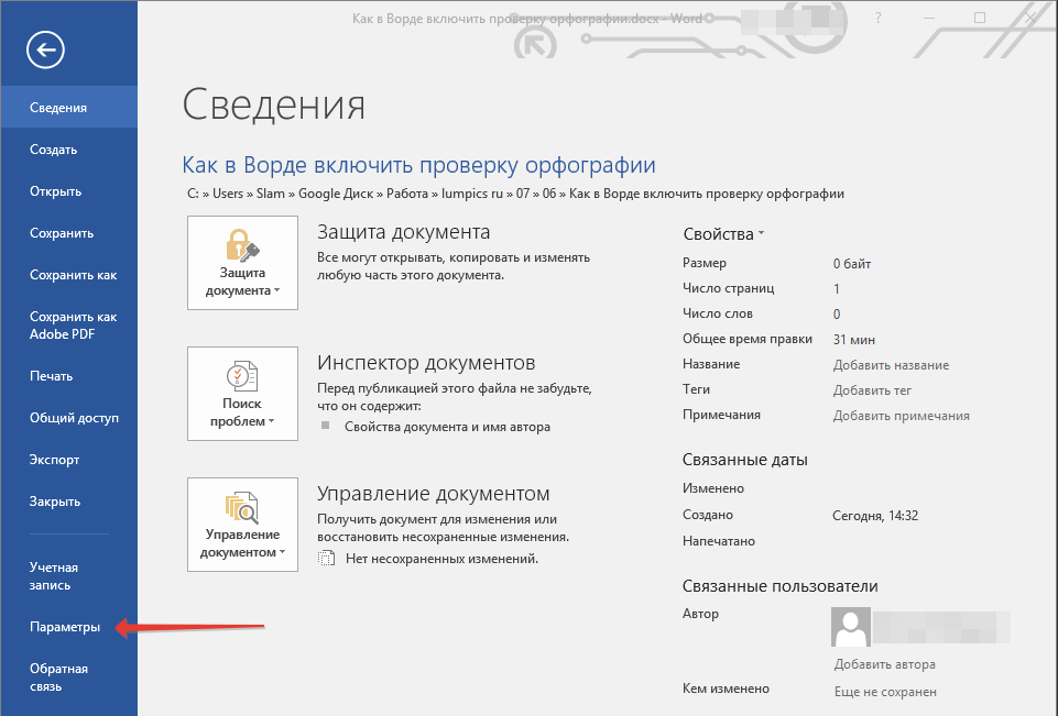 Если проверка правописания по прежнему не работает, и ошибки в тексте не выделяются, поступим следующим образом: откроем раздел «Файл» в верхнем меню редактора и нажмем здесь на кнопку «Параметры» в левой части экрана.