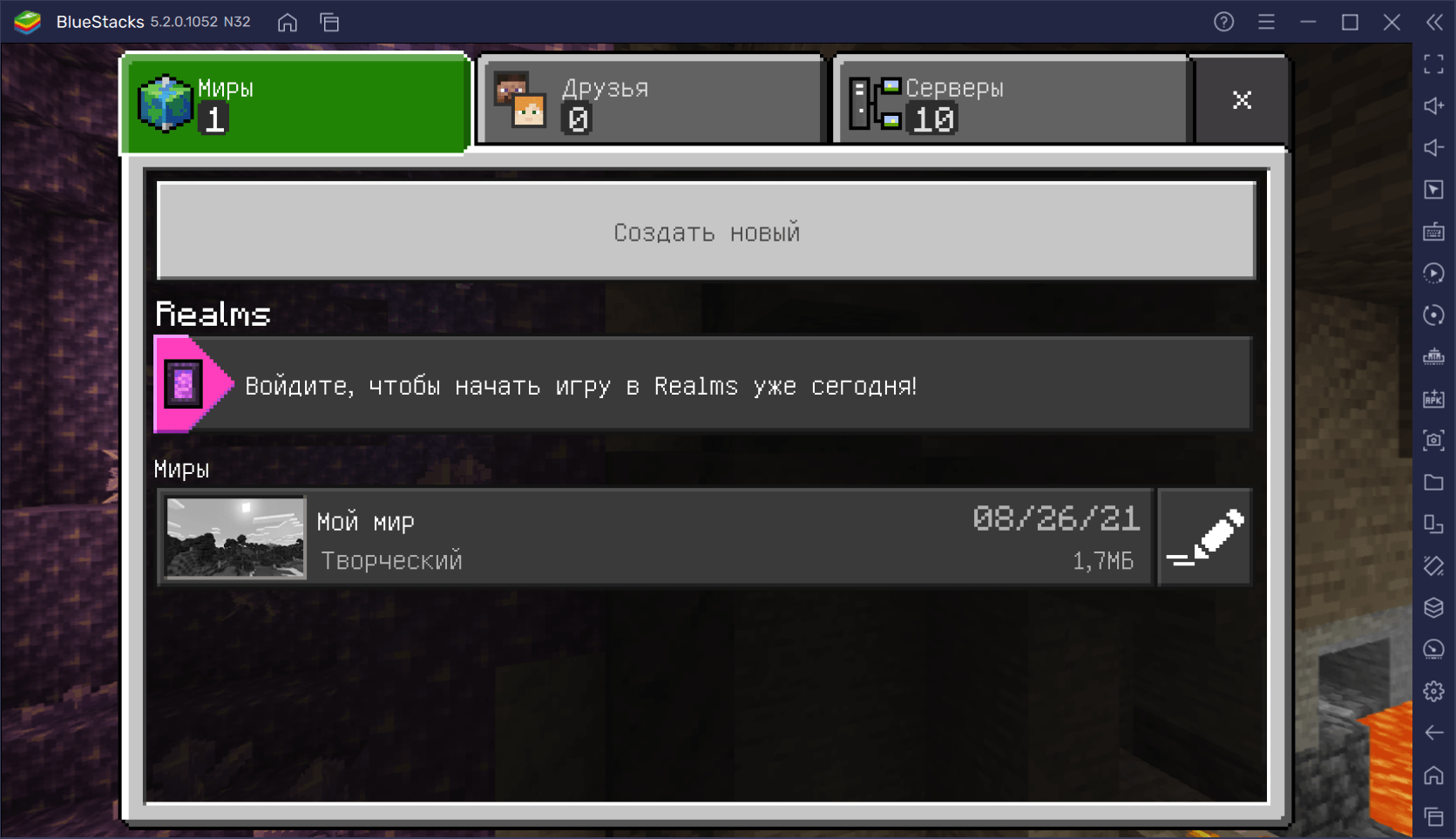 Для настройки основного управления в Minecraft мы советуем войти в режим свободного строительства и поставить самый низкий уровень сложности. Для этого в главном меню нажмите на кнопку «Играть». Затем, в открывшемся окне, выберите пункт «Создать новый»-> «Создать игровой мир»: