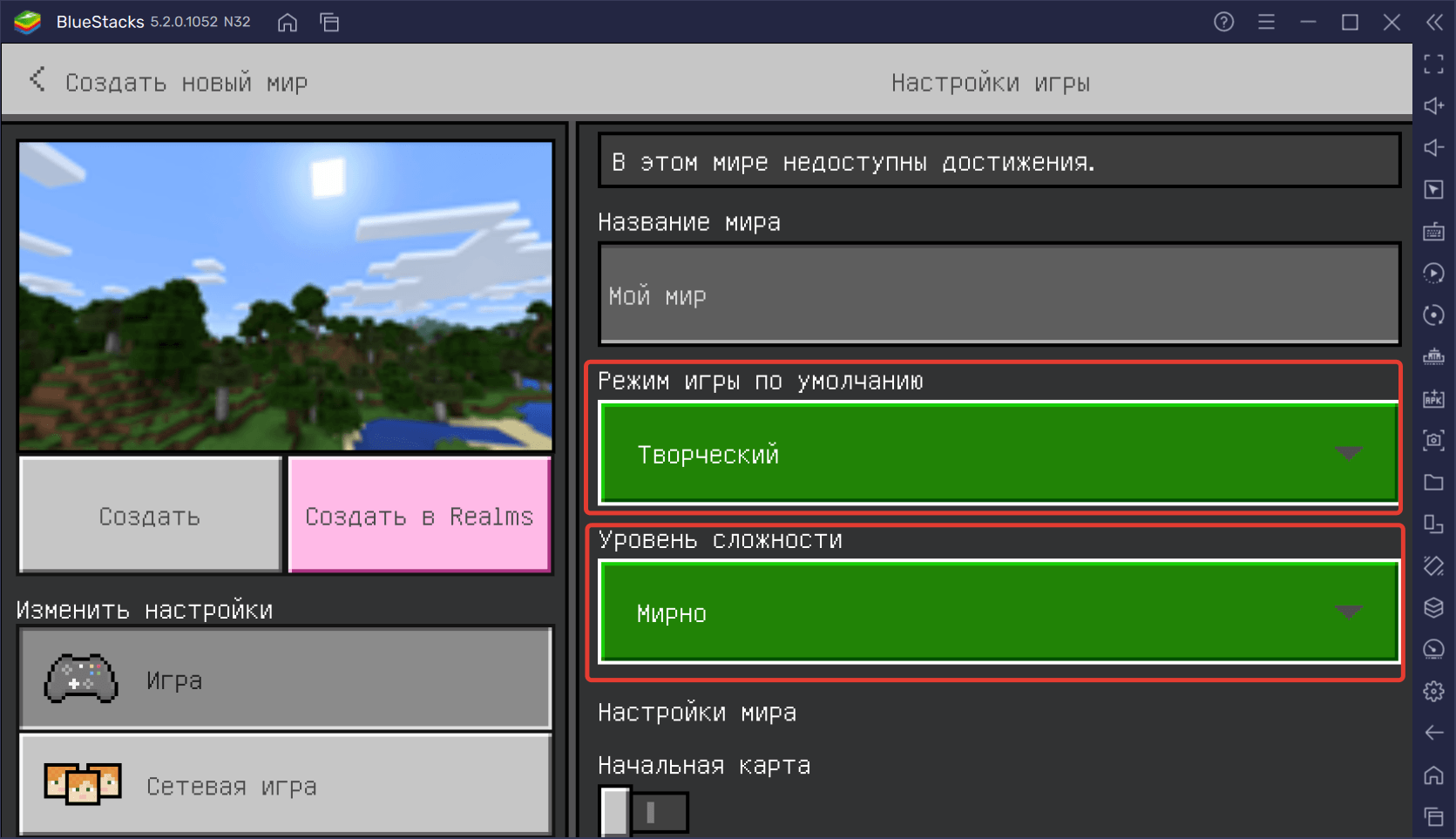 Установите режим игры по умолчанию «Творческий» и уровень сложности «Мирно»: