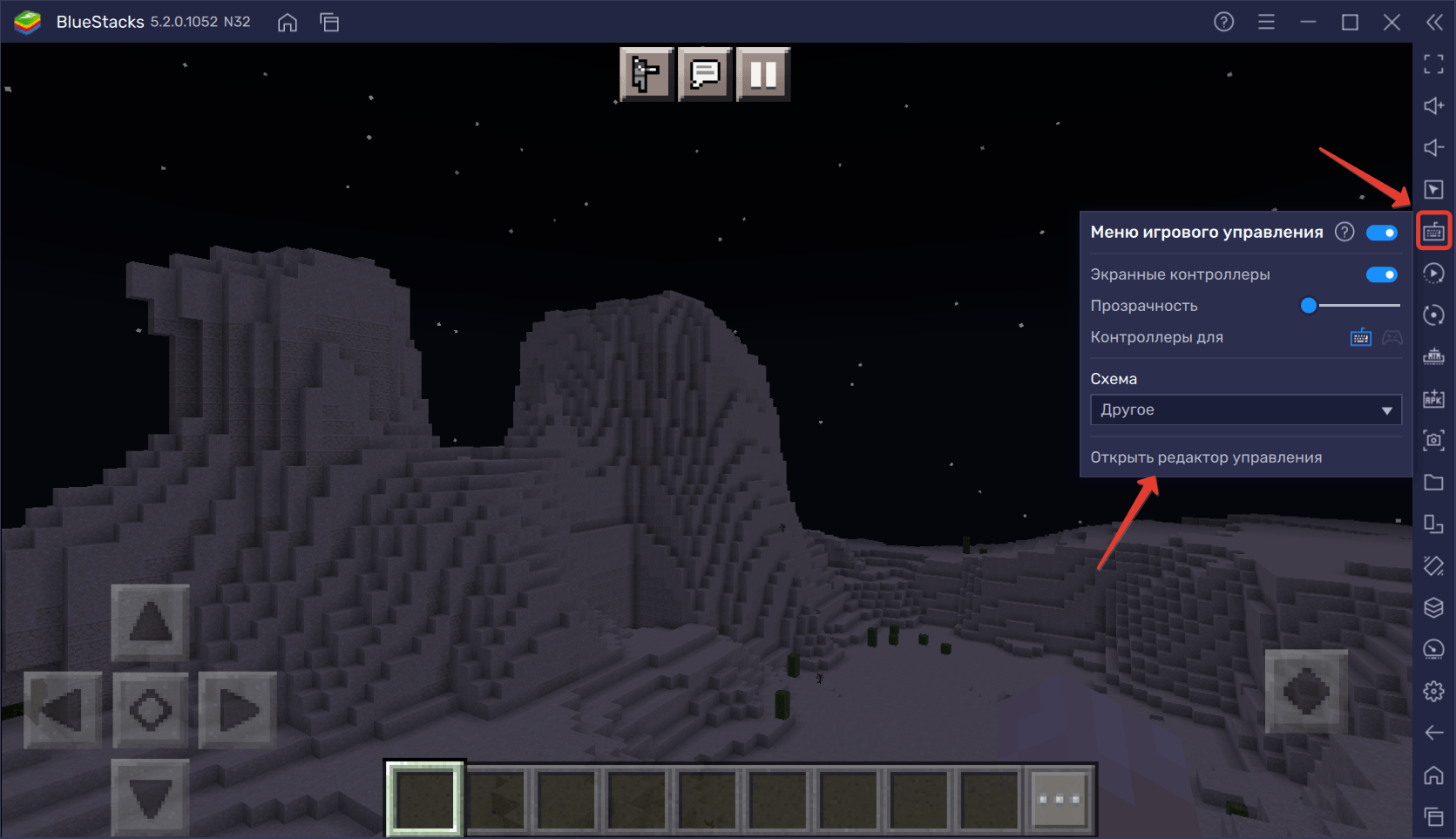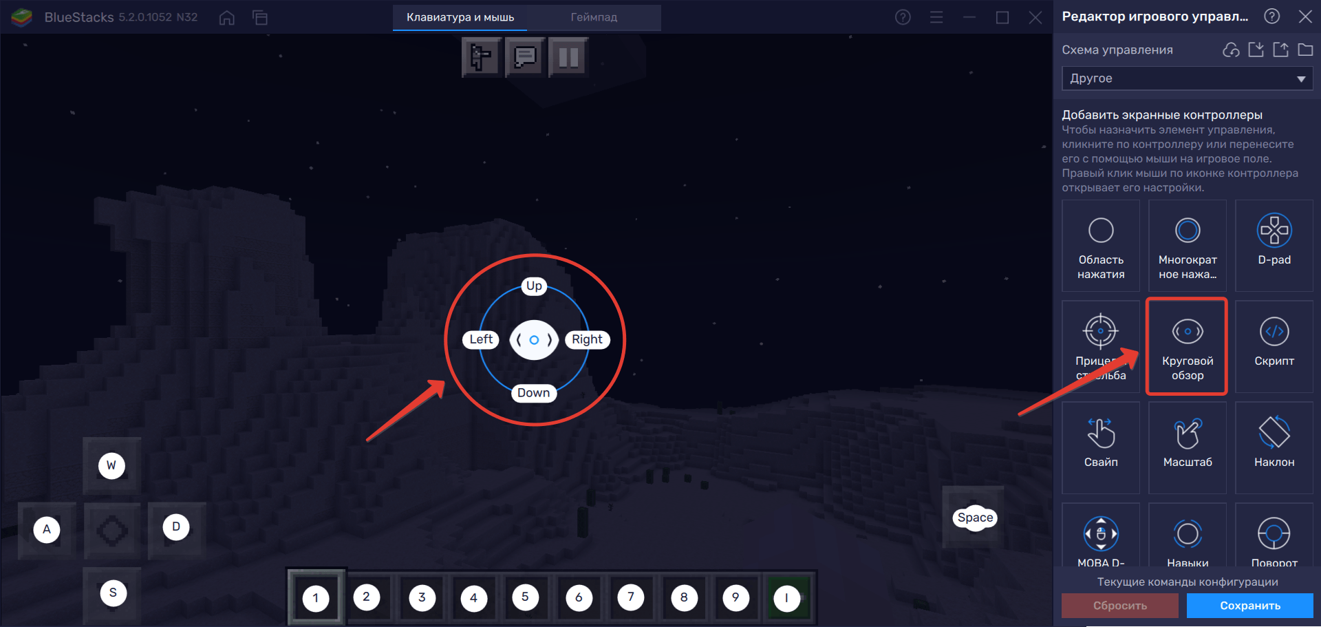 Повороты камеры — главный атрибут комфортной игры. Для того чтобы управлять ею в Minecraft на BlueStacks, перенесите в центр экрана контроллер «Круговой обзор»: