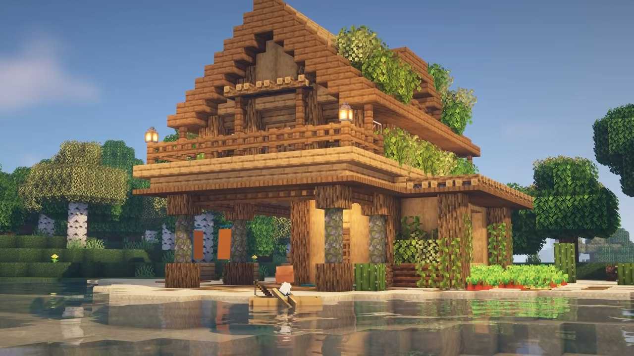 Вам скучно строить одинаковые и традиционные дома? Тогда попробуйте этот Beach House. Он отличается и уникален от всех других идей дома в этом списке. Этот современный дом кажется сложной идеей, но его можно построить с помощью простых шагов и материалов. Рядом с этим похожим на хижину домом есть бассейн, что увеличивает его красоту. Учебник содержит весь процесс постройки этого дома шаг за шагом, чтобы помочь вам понять процесс лучше и удобнее. Если вы ищете крутую идею дома в Майнкрафте, то это то, что вам нужно.