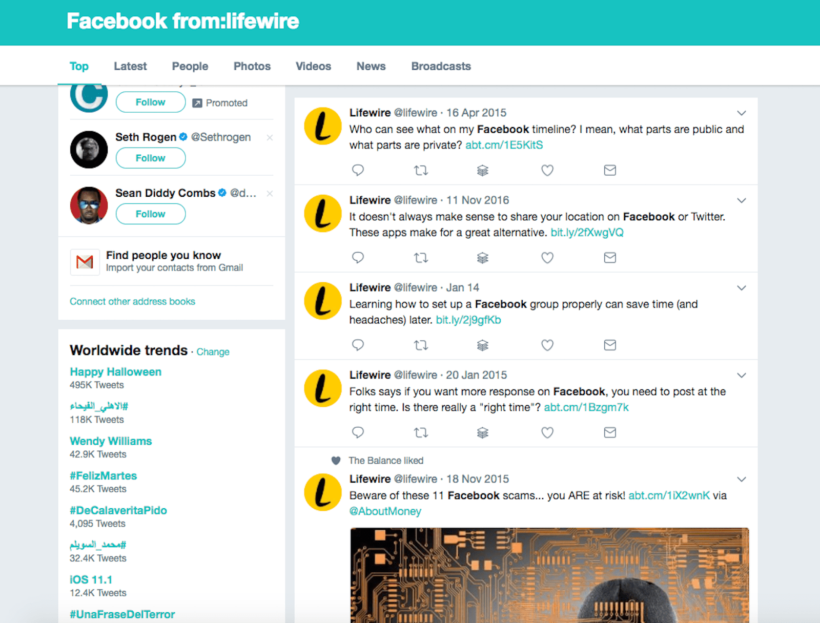 После выбора поиска вы увидите обычную страницу результатов поиска со всеми твитами из @Lifewire, содержащую термин «Facebook», перечисленный в порядке самых последних твитов. Это так просто!