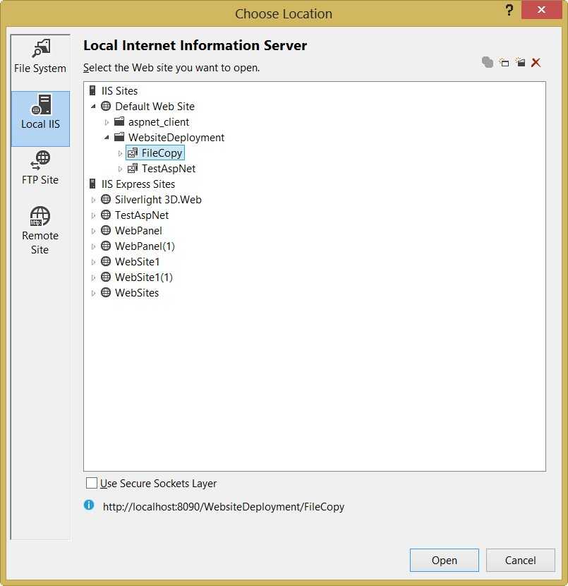 Как только вы выберите соответствующий пункт назначения, нажмите кнопку Open. Visual Studio попытается подключиться к удаленному сайт и получить список файлов.