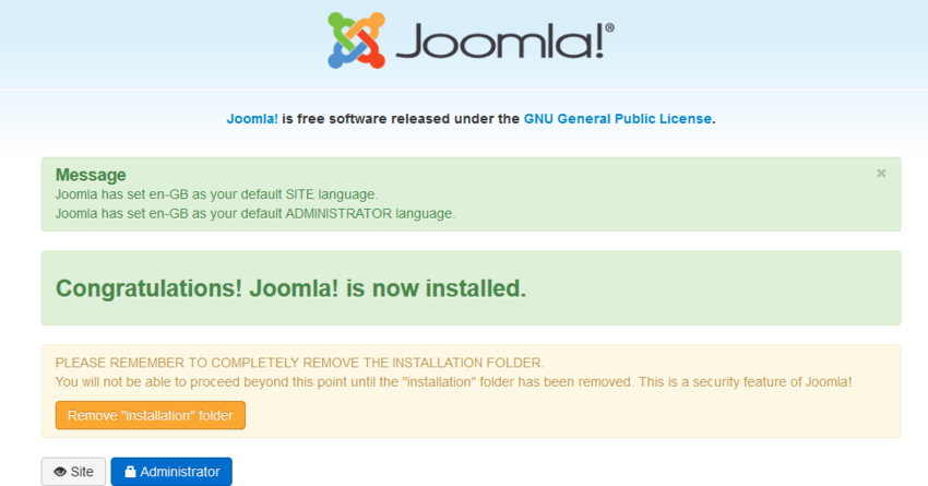 После успешной установки Joomla отобразится поздравительное сообщение с напоминанием об удалении папки установки. Если вы не нажмете кнопку «Удалить установочную папку», вы не сможете просматривать свой сайт.