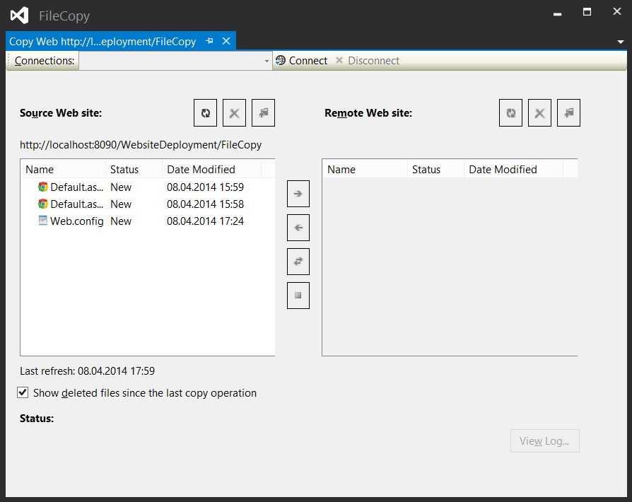 Это окно состоит из двух списков файлов. Слева находятся файлы в текущем проекте (на локальном жестком диске). Справа находятся файлы на целевом месте (удаленный веб-сервер). При первом открытии этого окна вы ничего не увидите справа, потому что вы не указали цель. Вы должны нажать кнопку Connect вверху, чтобы предоставить эту информацию. При этом Visual Studio откроет знакомое диалоговое окно, которое выглядит почти так же, как то, что вы видели при создании виртуального каталога для нового проекта. В этом окне вы можете выбрать одно из мест, куда нужно копировать веб-сайт: