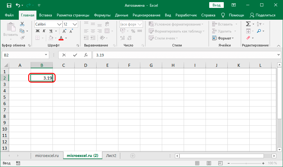 Иногда случается так, что во время ввода числа с точками, программа исправляет его на дату. Допустим, мы ввели число 3.19 в свободную ячейку.