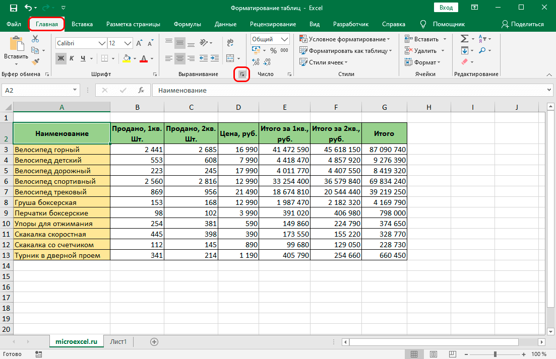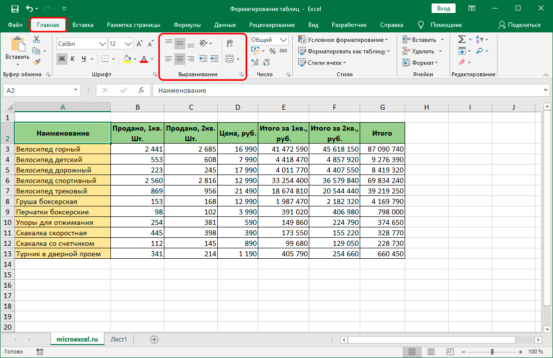 Выполнить выравнивание, также, можно как в окне форматирования ячеек, так и в главной вкладке программы, воспользовавшись инструментами на ленте.