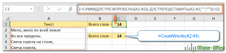 Для сравнения в C1 я записал формулу массива, при помощи которой мы также можем подсчитать количество слов в диапазоне.