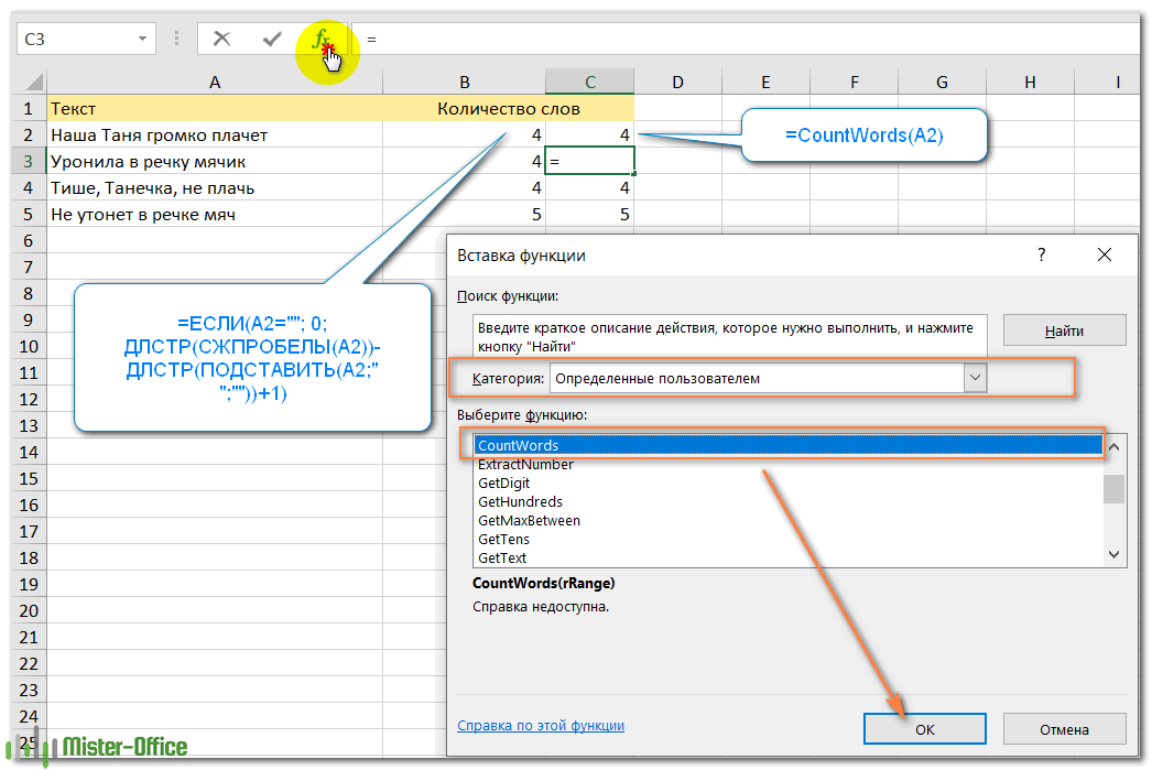 Первый способ. Нажмите кнопку в строке формул. Среди появившихся категорий вы увидите новую группу — Определённые пользователем. И внутри этой категории вы можете увидеть нашу новую пользовательскую функцию CountWords.