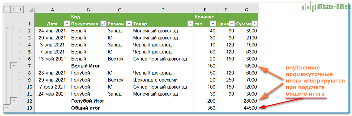 Например, если мы отфильтруем таблицу, чтобы отобразить продажи только черного шоколада, формула промежуточного итога не изменится, но все остальные товары будут удалены из итога: