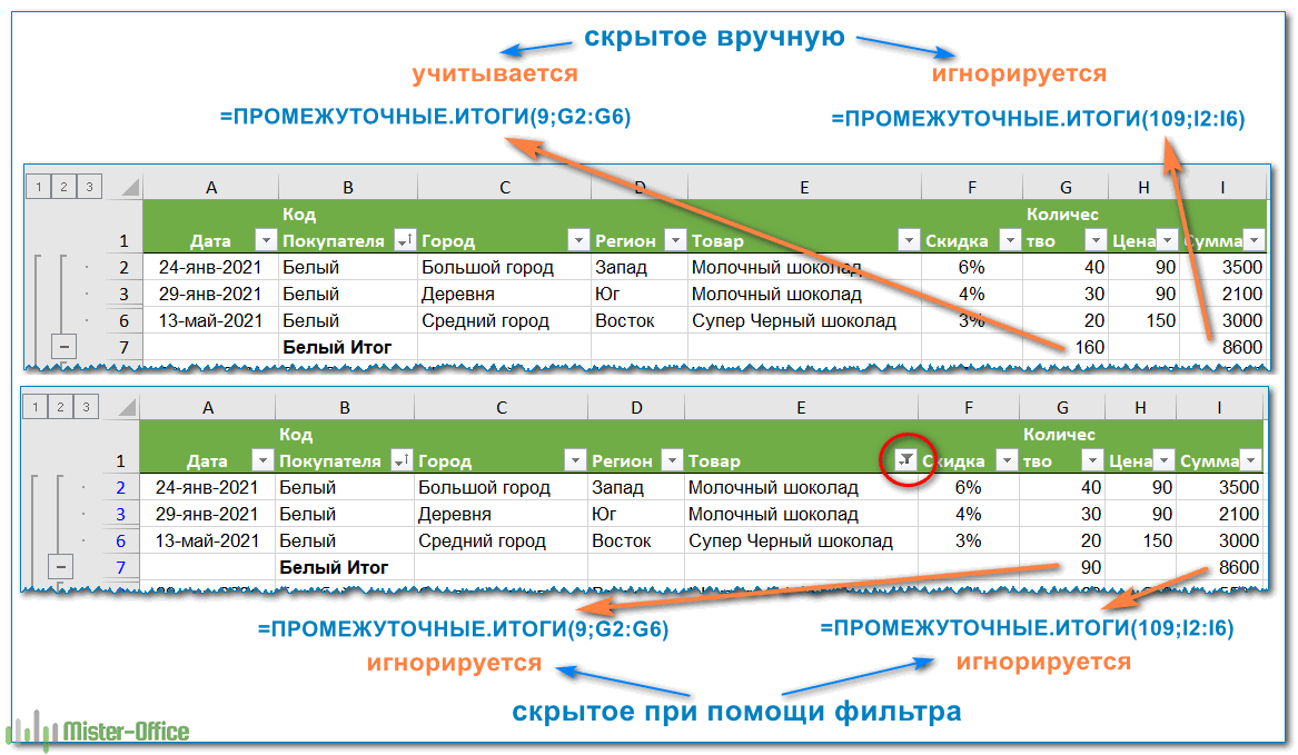 На рисунке ниже вы видите, что не следует использовать функцию 9, если вы руками скрывали какие-либо строки в вашей таблице. При этом функция 109 всегда возвращает результат исходя только из видимых на экране значений.