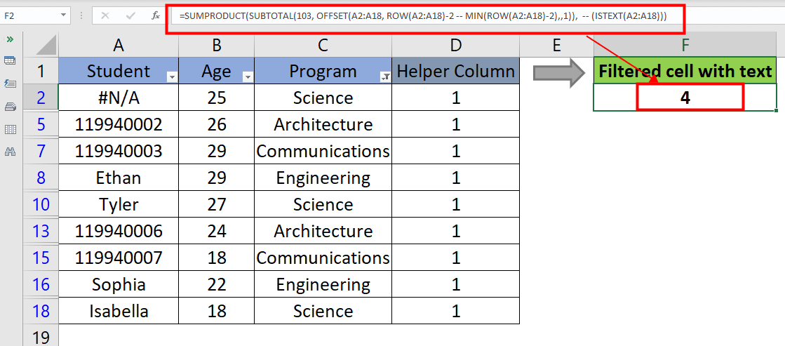 Другой метод подсчета отфильтрованных ячеек с текстом — использование сочетание SUMPRODUCT, SUBTOTAL, КОСВЕННЫЕ, РЯД & ISTEXT Функции. Пожалуйста, сделайте следующее.