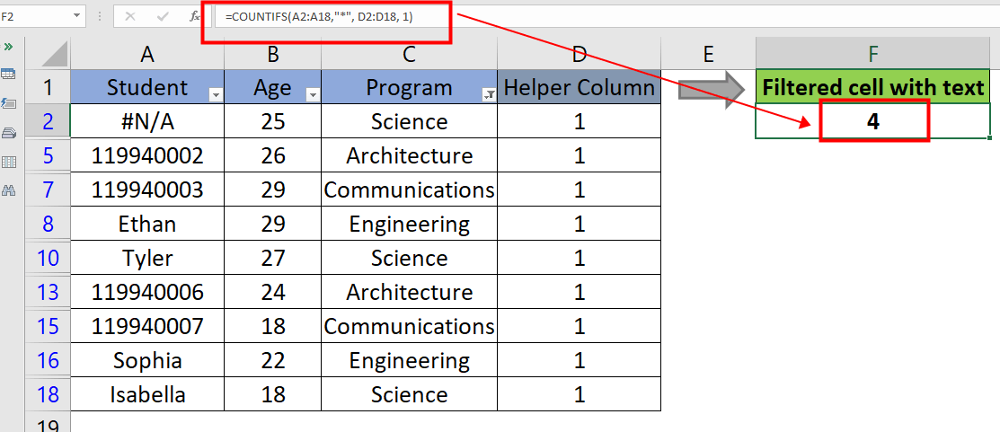 Мы видим, что есть 4 ячейки с текстом в отфильтрованных данных.