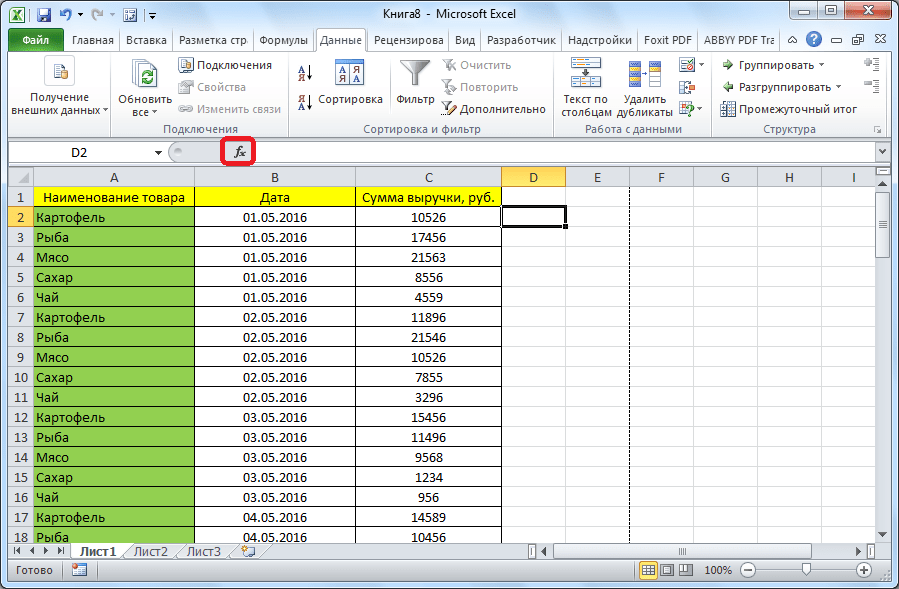 - Предварительно кликнув по ячейке, где будут выводиться промежуточные итоги, жмем указанную кнопку, которая расположена слева от строки формул.